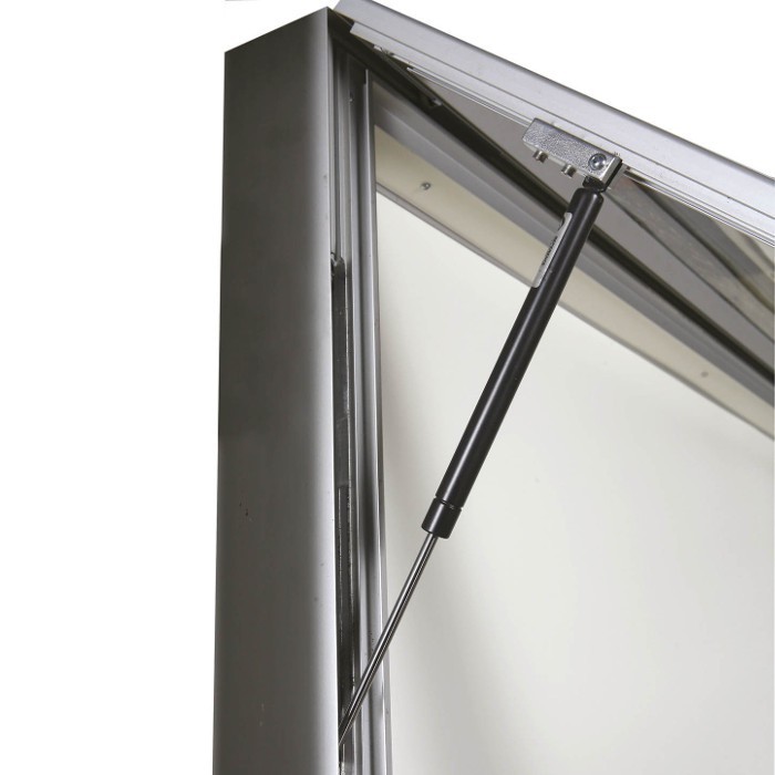 Vitrine d'extérieur d'une épaisseur de 87 mm avec cadre en aluminium anodisé, éclairage LED, vitrage méthacrylate, serrure intégrée.
